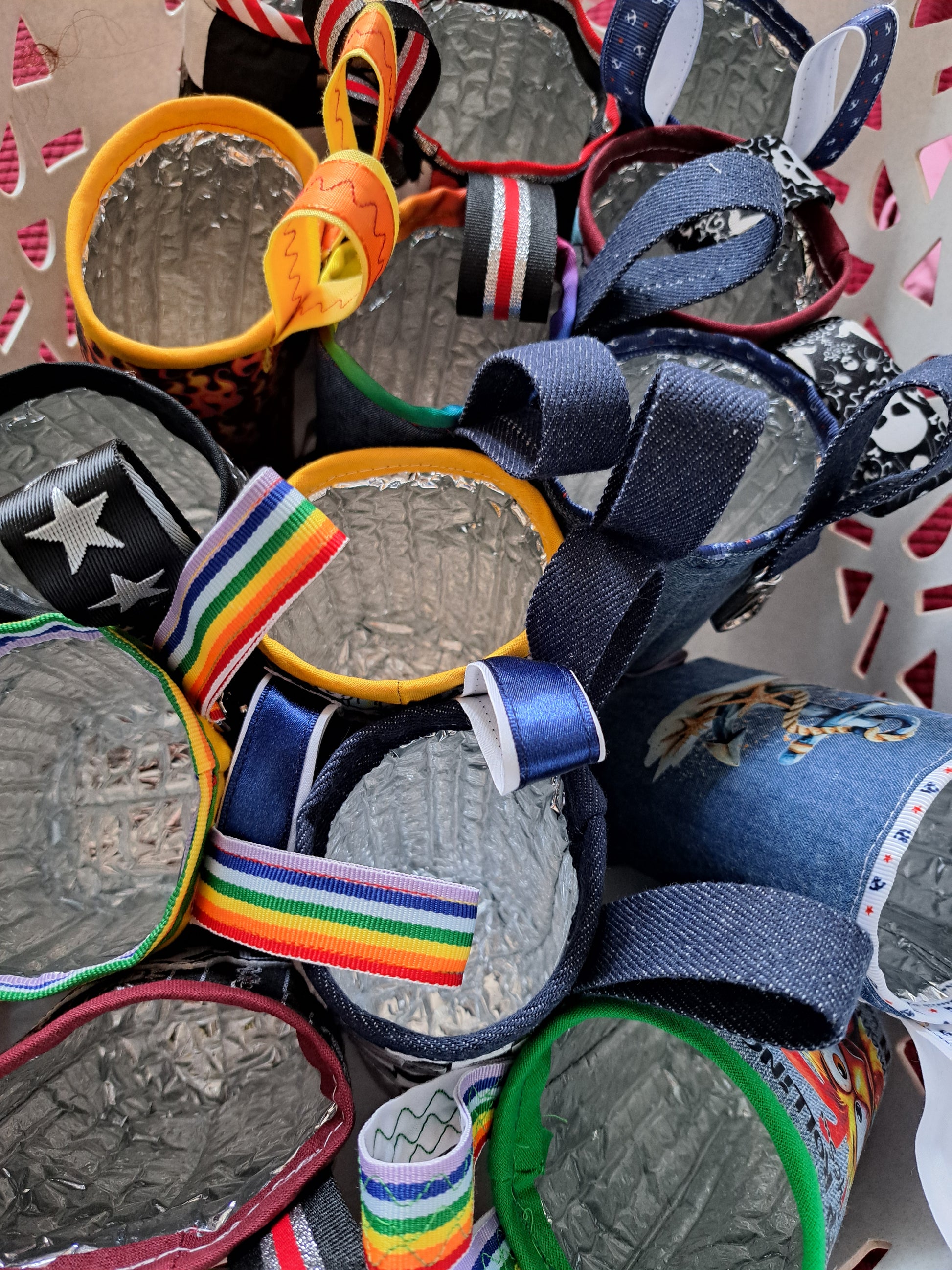 S: oben offen. Mit Schlaufen zum Anhängen an den Gürtel. Geeignet für 5dl Getränkeflaschen/ -Dosen