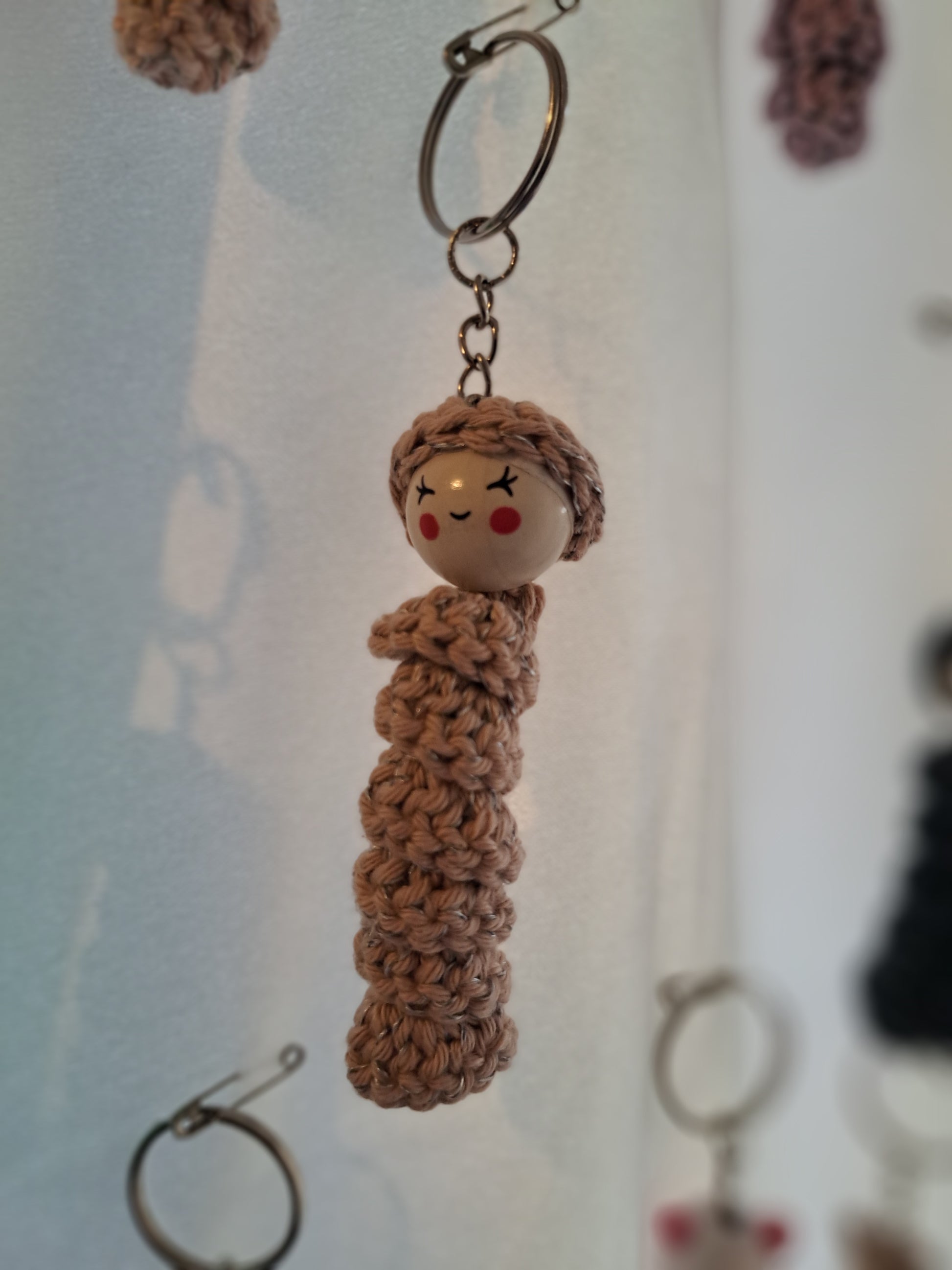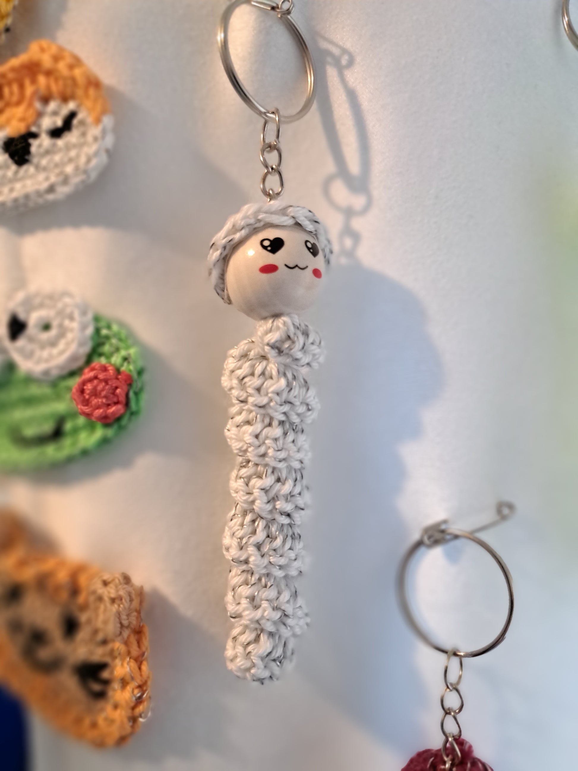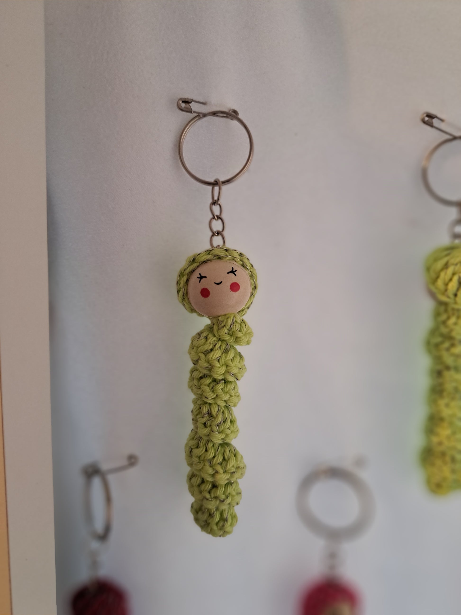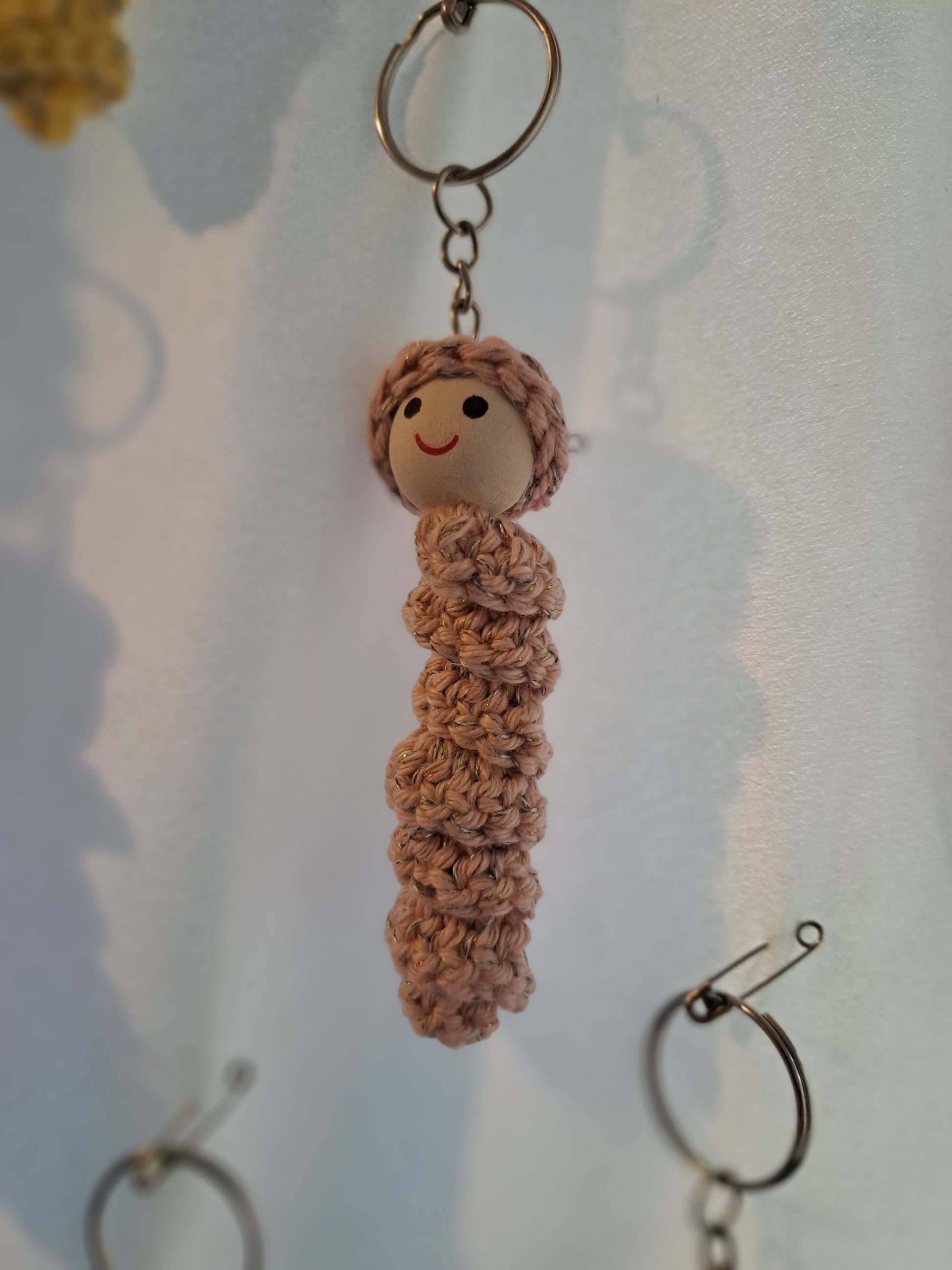 Sorgenwürmchen gehäkelt mit eingearbeitetem reflektierendem Faden. Schlüsselanhänger. Ideal für an die Jacke oder den Rucksack. Jedes Würmchen ein Unikat (Farbe und Gesicht)